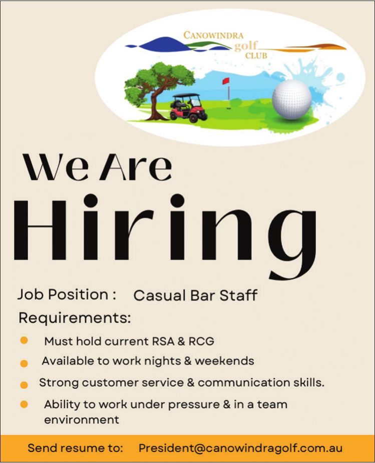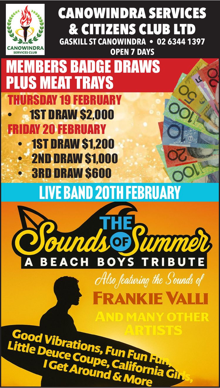 Canowindra Services Club Thursday Members Badge Draw $2,000. Happy hour 5 – 7pm. |
