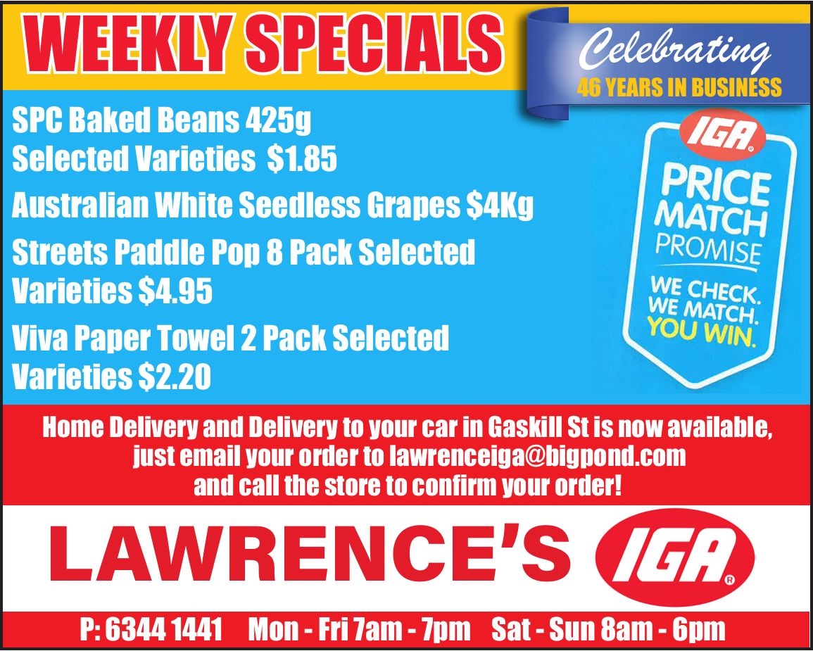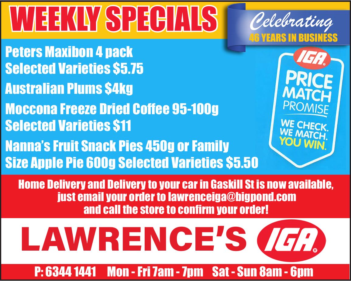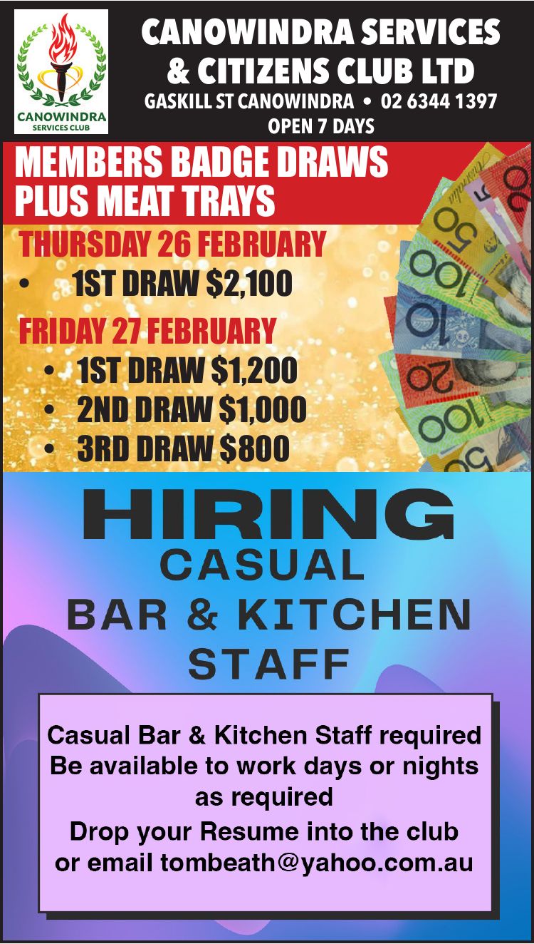 Canowindra Services Club Friday Night Meat Raffles 7pm to 8.30pm plus Members Badge Draw. 1st draw $1,200, 2nd draw $1,000, 3rd draw $600. Happy hour 5 – 7pm. |