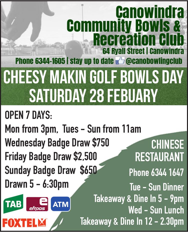 Canowindra Bowls Club Sunday badge draw $650 up for grabs. Major Jackpot at 7pm. |