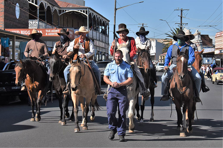 While Gaskill Street was filled with thoroughly modern locals and visitors, a group of reenactors brought a famous 1863 event back to life on Saturday’s street parade, performing the siege on Robinson’s Hotel (now Royal Hotel) by Ben Hall and his gang. The gang was headed up by Matthew Rice as Ben Hall, with Beau Watt as Frank Gardiner, Bob Meyers as John O’Meally, Dylan Slattery as Johnny Gilbert and Justin Hancock as John Dunn.