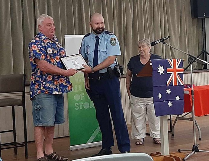 Citizen of the Year, Tom Beath pictured with Senior Con­stable Michael Rodham and Cr Jenny Weaver.