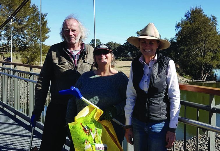 Wendy, Marion and John out collecting rubbish from the swinging bridge waterfront.