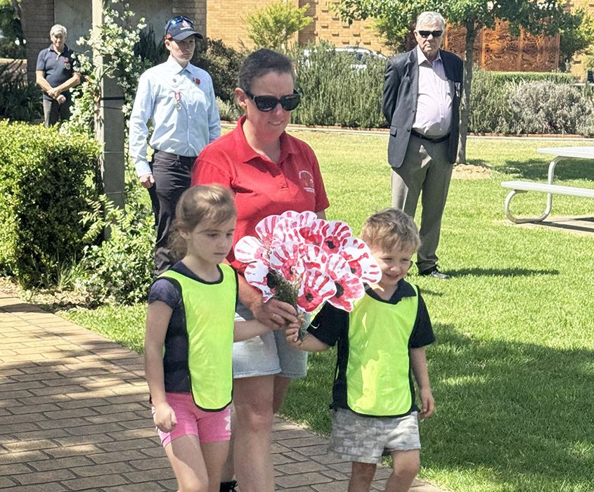 Early childhood educator Jackie Watson assisted Canowindra Preschool students lay their lovely boquet tribute.