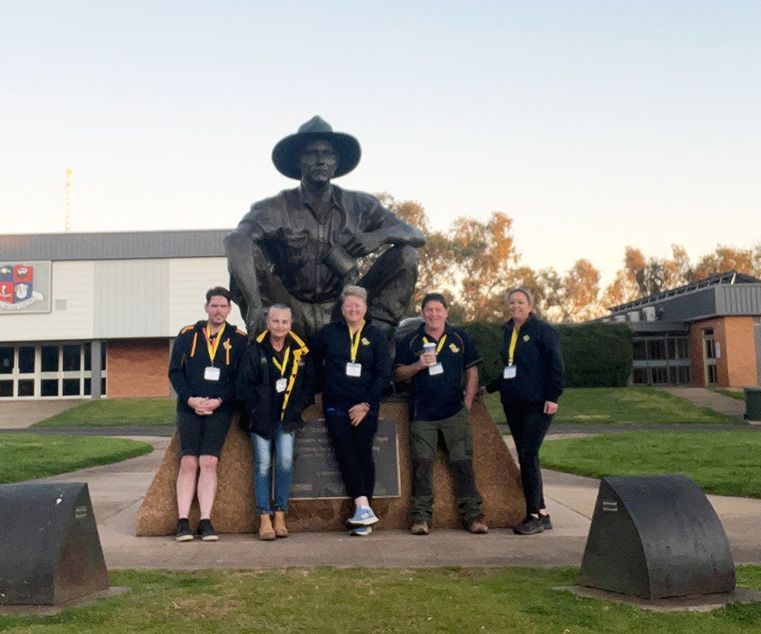Michelle and fellow travelling companions standing with the iconic Cunnamulla Fella statue in QLD.