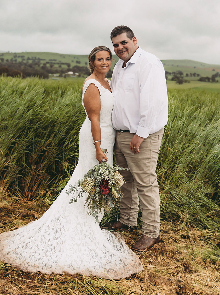 Maddi looked absolutely stunning in a full length lace, mermaid style dress. She was accompanied by bridesmaids Brittney Kelly from Orange and Caitlin Curtis from Cowra, who wore lovely sage green, full length dresses. The girls choice of cowgirl boots were in hindsight, a solid decision to help them navigate the mud and puddles on the day.